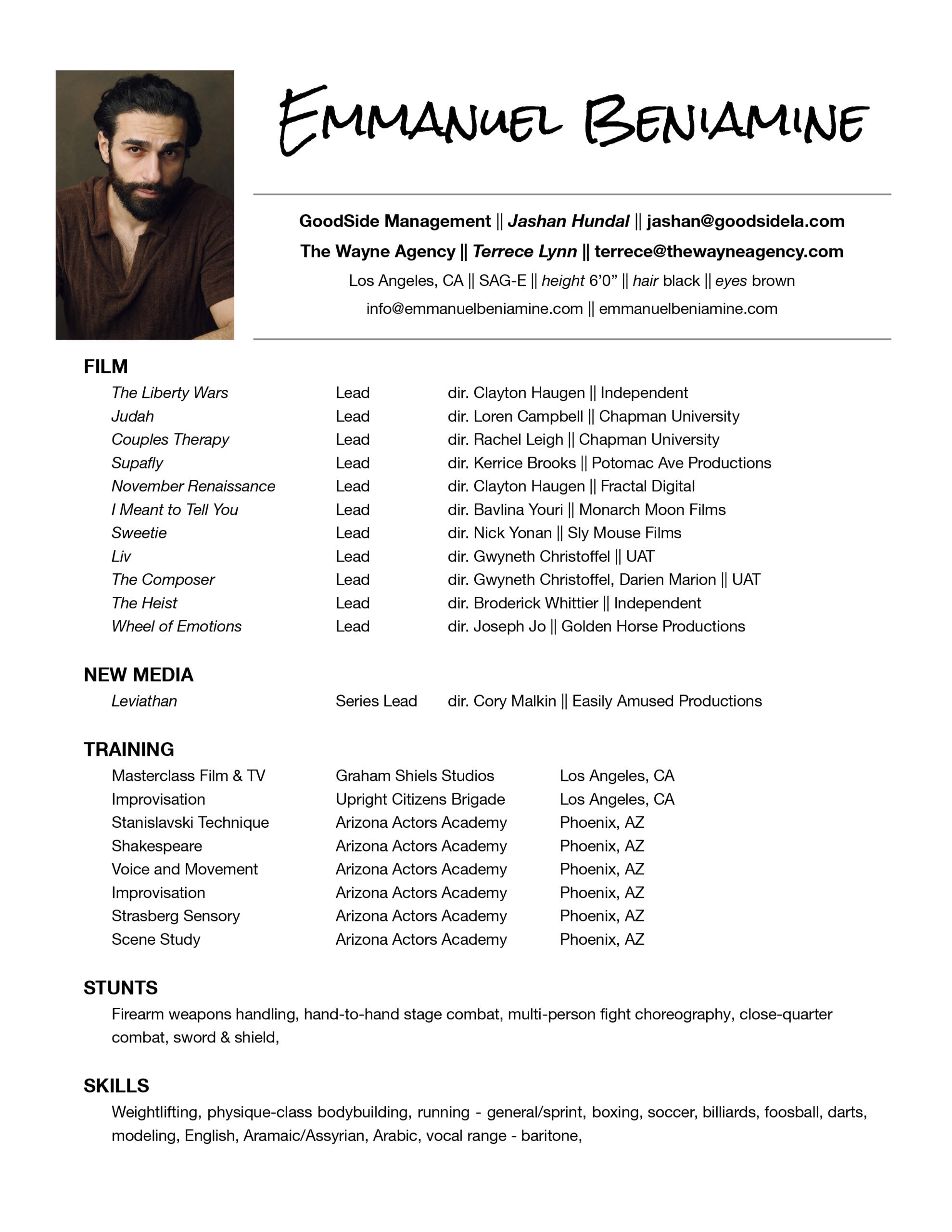 Born in Chicago & raised in central California, Emmanuel is of Assyrian/Mesopotamian descent & speaks Aramaic, English & Arabic.He started his acting journey at a conservatory in Phoenix, AZ led by Brandy Hotchner. Intense, dark, and enigmatic, Emmanuel has performed lead roles in multiple films ranging from thrillers, sci-fi, dystopian themes, & comedies. A man of many hats, his projects have been nominated & won awards at various film festivals internationally. Including Loren Campbell’s Judah, Rachel Leigh’s Couples Therapy and Kerrice Brooks’ directorial debut of Supafly.Emmanuel’s extensive training in LA includes the Film & TV Masterclass at Graham Shiels Studios taught by Selina Kaye and Graham Shiels. Emmanuel’s other passions include screenwriting, short form content creation, & music production.Relentless work ethic, dedicated consistency, and a strong sense of self-discipline is how I approach business, the craft, and the Art of Acting. ~EmmanuelManaged by Jashan Hundal at GoodSide Management in Los Angeles, CA.IMDB